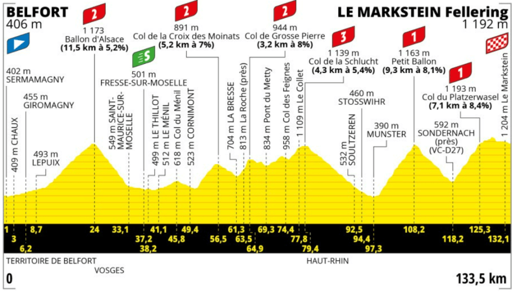 Además, los puertos de mayor categoría se encuentran enlazados al final, siendo el Petit Ballon de 9’3 kilómetros al 8’1% y el Col du Platzerwasel de 7’1 kilómetros al 8’4% los últimos jueces de este Tour de Francia.
