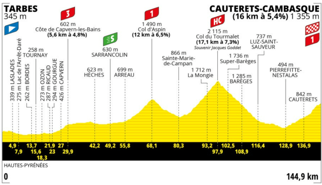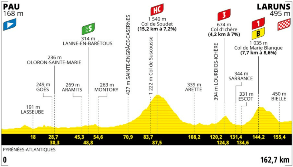 En la etapa 5, los ciclistas afrontarán el primer puerto hors categorie de la carrera, el Col de Soudet, de 15’2 kilómetros al 7’2%, mientras que a 18 kilómetros de meta coronarán el Col de Marie Blanque, puerto de 7’7 kilómetros al 8’6% en el que algunos ciclistas de la general seguro que lo prueban.