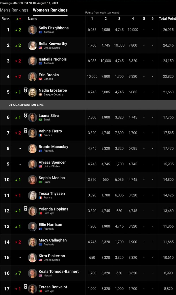 El evento de Portugal será muy importante para empezar a garantizar plazas de algunas surfistas, pero varias de ellas necesitan 2 buenos resultados y será en la cita de Brasil donde tendremos el desenlace con Luana participando en casa buscando la machada y ya seguramente con más del 60% de chicas descartadas de la lucha por el ascenso, pero con unas 15 surfistas buscando estar en el Top5 general. Ya que una medalla de oro las auparía a los puestos de privilegio.